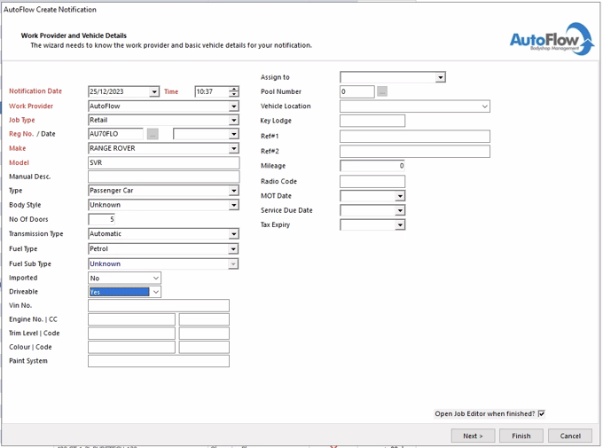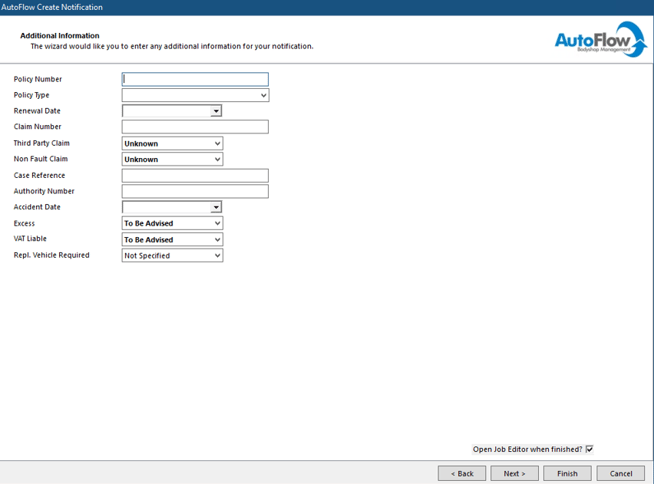 By checking the box that says "Open Job Editor when finished," the AutoFlow system will automatically open the Job Edit module when you click on Finish. From there, you can easily get in touch with the customer to schedule an estimate appointment.